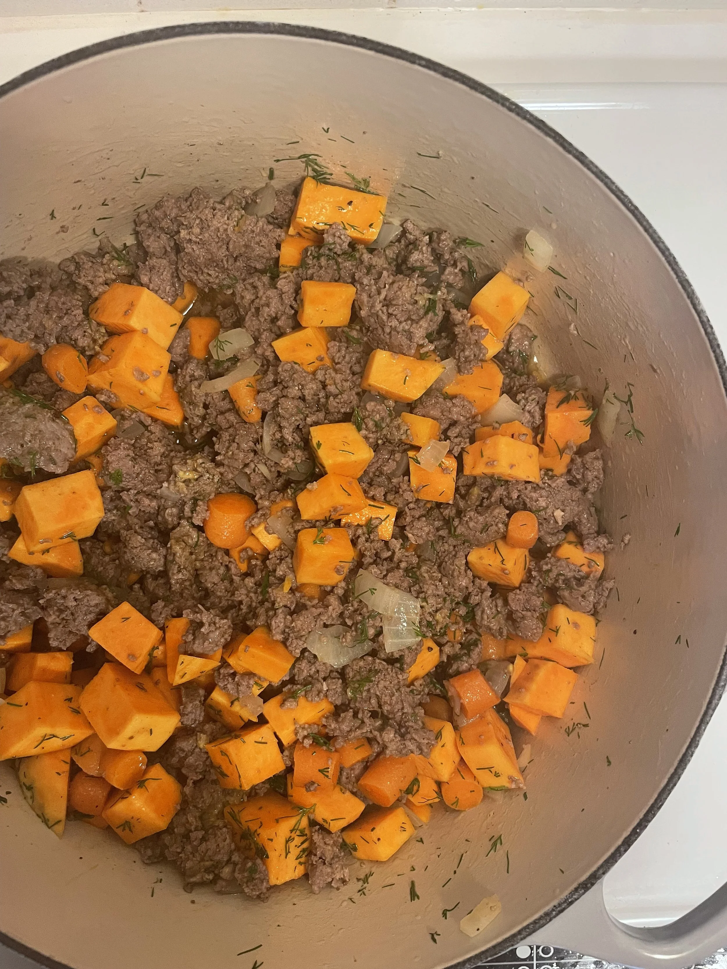 Next, add the bone broth and dill. Stir and let it cook for 30 minutes on medium-low with the lid on. Stir occasionally.